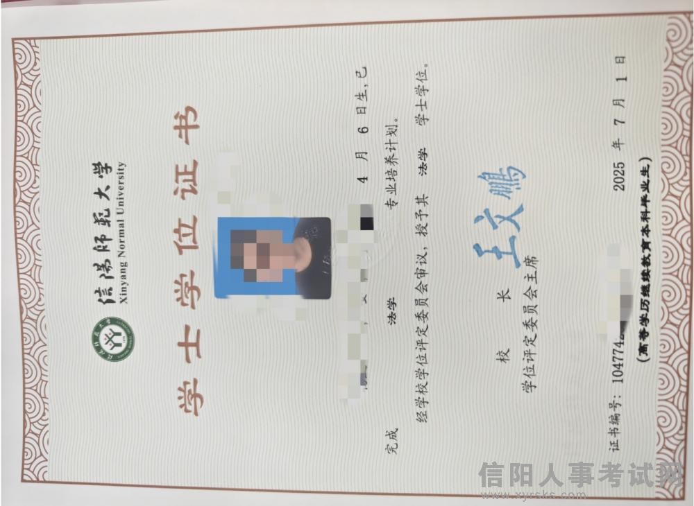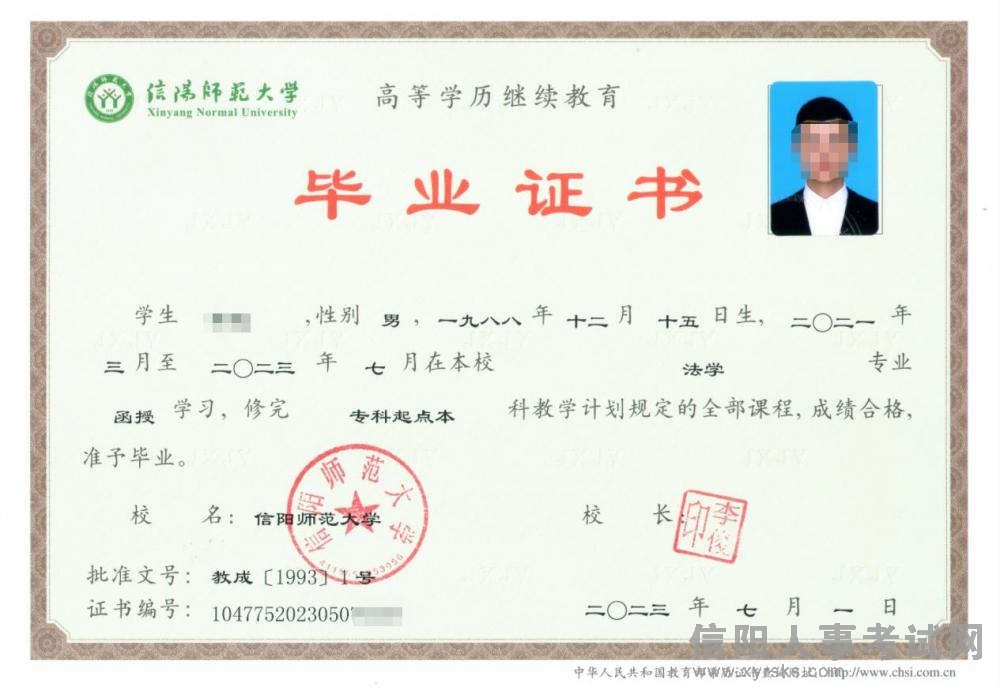 凡经我校录取的考生,通过入学资格审核,办理报到注册手续,取得学籍,在规定时间内修完教学计划规定课程,成绩合格,思想品德鉴定合格者,颁发信阳师范大学高等学历继续教育毕业证书,证书信息在中国高等教育学生信息网(学信网)注册,国家承认学历。本科毕业且符合学士学位授予条件者,可申请取得学士学位。