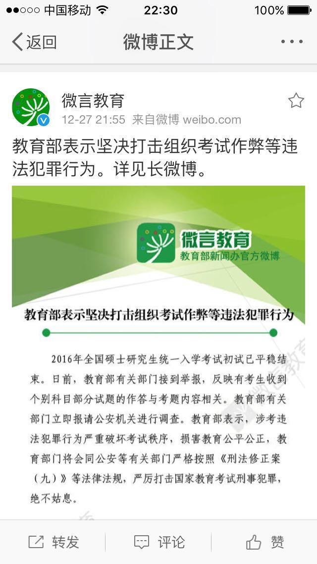 这条长微博显示,2016年全国硕士研究生统一入学考试初试已平稳结束。日前,教育部有关部门接到举报,反映有考生收到个别科目部分试题的作答与考题内容相关。教育部有关部门立即报请公安机关进行调查。教育部表示,涉考违法犯罪行为严重破坏考试秩序,损害教育公平公正,教育部门将会同公安等有关部门严格按照《刑法修正案(九)》等法律法规,严厉打击国家教育考试刑事犯罪,绝不姑息。