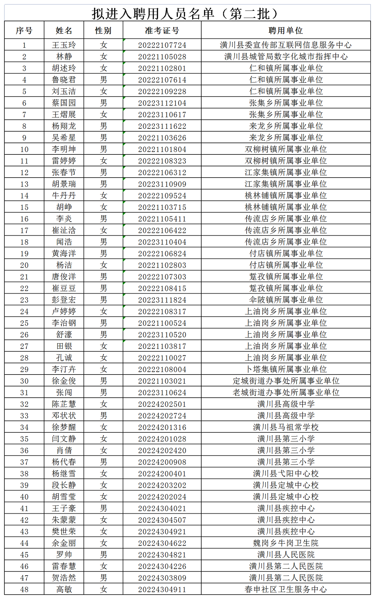根据《潢川县2022年招才引智公开招聘事业单位工作人员公告》有关规定,经笔试、面试、体检、考察等程序,根据疫情原因和政审情况,现确定第二批事业单位拟聘用人员(名单见附表),现予以公示,公示期为7个工作日(2022年12月8日至12月16日),公示期间接受社会监督。