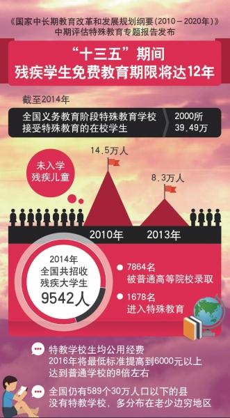 昨天,教育部公布《国家中长期教育改革和发展规划纲要》实施五周年特殊教育发展情况。教育部基础教育二司负责人表示,“十三五”期间,我国将实现残疾学生高中阶段免费,使残疾学生的免费教育达到12年。
